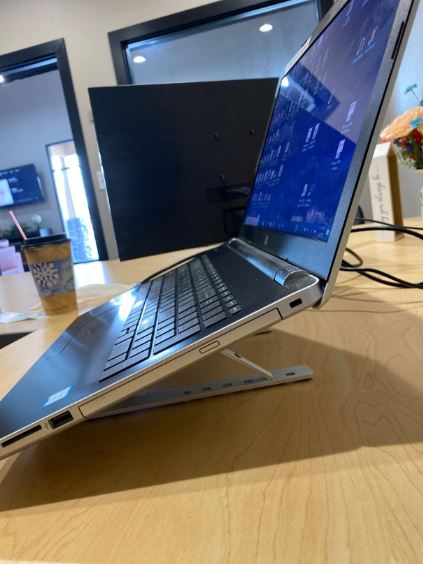 The improved angling of the laptop’s screen relieves strain on the neck, back, wrists, and eyes.