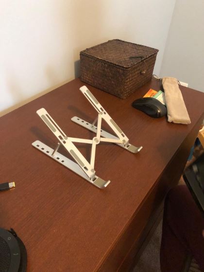 With staying indoors these days (Covid 19)… Zoom has become my new “normal”. Having to put my laptop on top of a box (find the right size) to get the perfect angle has been a hassle I didn’t need. I purchased this Stand… and I can’t be happier! It gives me the perfect angle for viewing and typing. Then it folds up and I can put it in a drawer until I need it next. I am thrilled with this and highly recommend it to anyone. VERY sturdy, has rubber lined on both sides (for your computer AND your table), folds neatly in a little pouch (provided), and holds my laptop perfectly. I tried it with my 15″ PC and it was fine with that size as well. LOVE!!!