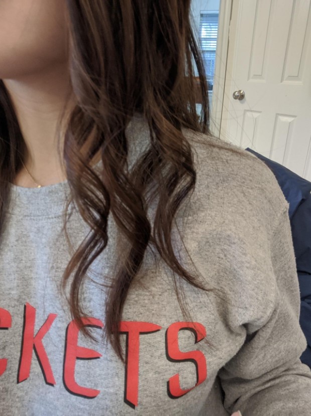I like that there is no cord that gets in the way. I also like that the outer barrel of the curler stays pretty cool, cool enough so you can touch it if you want. It definitely gets warm but you won’t get burned by it. The overall weight is pretty light so your arms don’t get tired. I like that you can change the direction of it so you can work easily on both sides of your head and even change the direction of the curls on the same side if you want. I haven’t had any issues getting my hair stuck or tangled in any way.